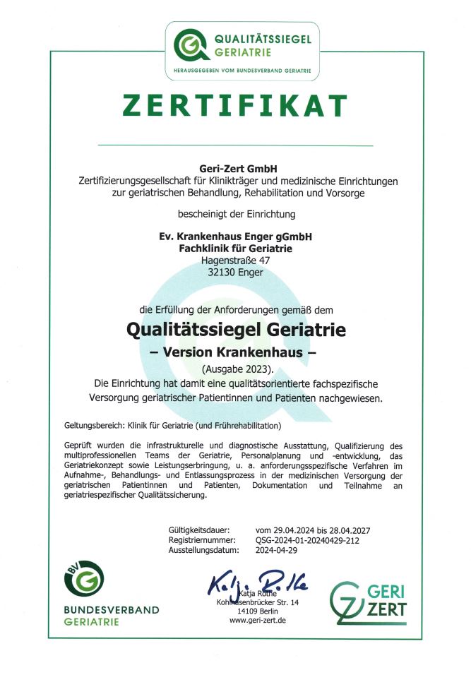 Unsere Arbeit wird regelmäßig überprüft und spiegelt sich im Qualitätssiegel Geriatrie des Bundesverbandes Geriatrie wider. Zusätzlich veröffentlichen wir zweijährlich unsere Qualitätsberichte, um Transparenz über unser Leistungsangebot und die Qualität unserer geriatrischen Versorgung zu schaffen.
